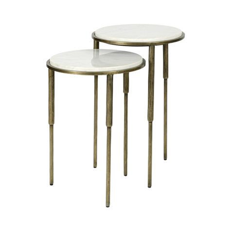A pair of side tables with hammered iron legs in an antique gold finish and marble top.
